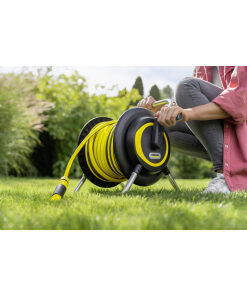 Singular practicality. Double functionality. This hose reel is used both for storing the hose on the wall and for mobile use in the garden. Nozzles and spray lances can be hung on the wall bracket and are always ready to hand. The HR 4.30 can be easily removed from the holder and is comfortable to carry thanks to the ergonomic handle. With the help of the free-running crank handle, the garden hose can be rolled up effortlessly and stored neatly and carefully, without kinks or annoying tangles. The product also scores points for its compact design, high stability thanks to its low centre of gravity and 30 m garden hose, connectors, tap adapter and nozzle. The hose reel is fully assembled and ready for immediate use. The device is also UV and frost-proof, making it long-lasting and robust enough to cope with everyday use.